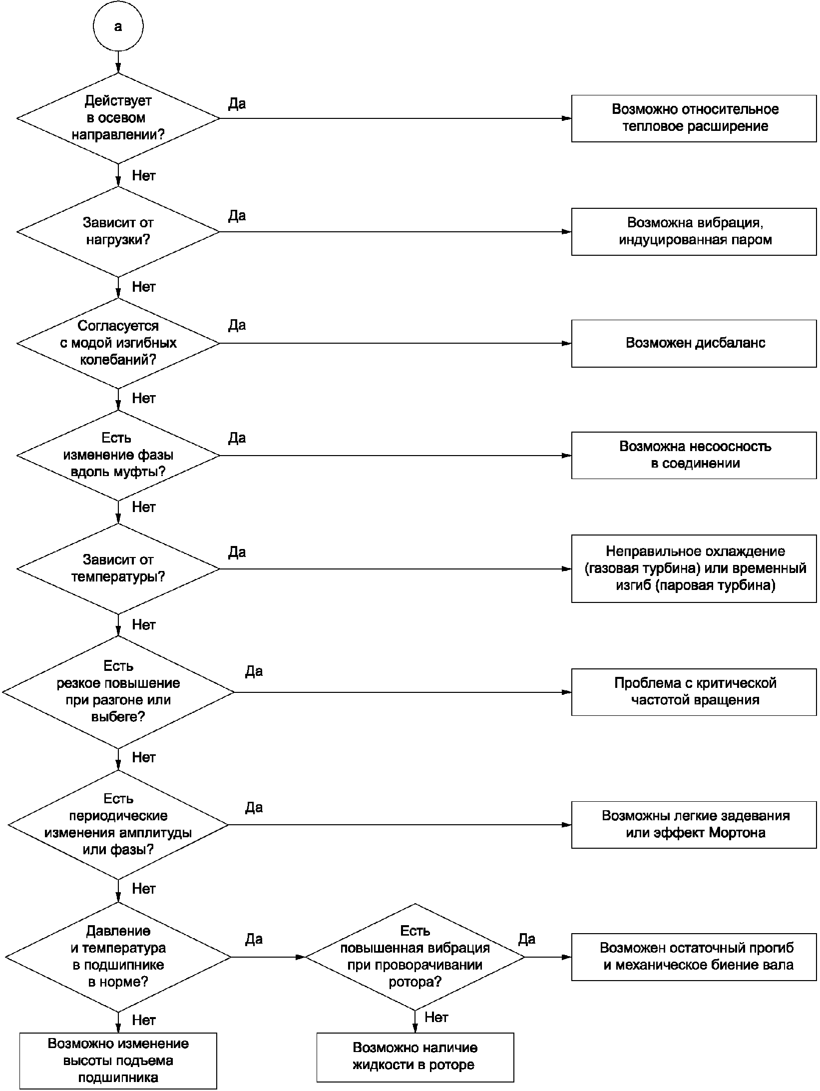 рисунке B.2 рассматриваются вопросы о природе вибрации на частоте вращения. Так, если эта вибрация действует преимущественно в осевом направлении, то в качестве основной причины следует рассматривать относительное тепловое расширение элементов турбины. Если она действует в радиальном направлении, но зависит от нагрузки, то в случае паровой турбины основная причина повышенной вибрации будет с наибольшей вероятностью связана с потоком пара. Если вибрация на частоте вращения стабильна и согласуется с модой колебаний ротора (при условии, что та известна - в противном случае следует обратиться к динамической модели "ротор - опора"), то в качестве основной причины следует предполагать наличие дисбаланса. Если для этой вибрации характерно изменение фазы при прохождении вдоль сочленяемых валов через соединительную муфту, то следует предполагать наличие несоосности этих валов. Если вибрация изменяется с изменением температуры, то в газовой турбине это может быть вызвано неправильной работой системы охлаждения ротора, а в паровой - временным температурным изгибом ротора.