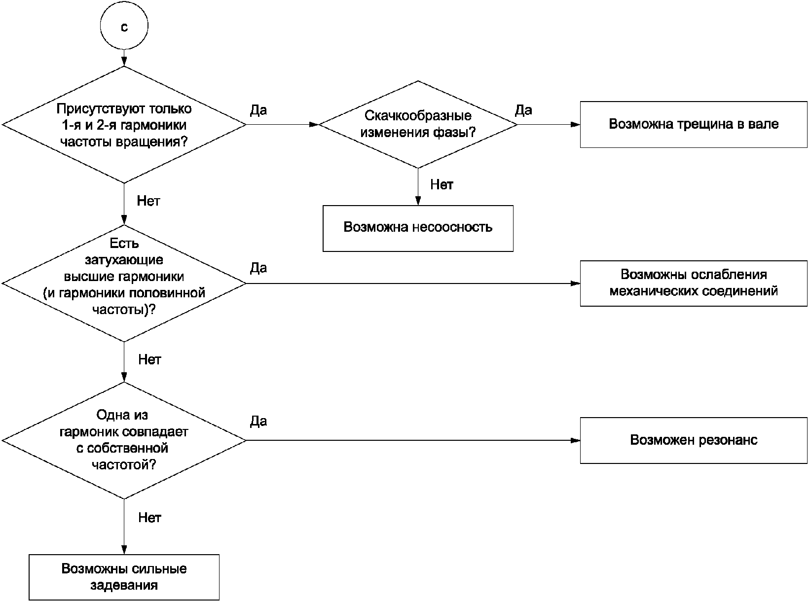 рисунке B.4. При наличии только первой и второй гармоник следует проверить стабильность их фаз. Отсутствие стабильности может свидетельствовать о наличии в вале трещины. Обычно этот дефект проявляет себя вначале в виде скачкообразных изменений фазы первой гармоники, а по мере развития - в аналогичных изменениях фазы второй гармоники. Если вибрация на этих гармониках стабильна, то следует рассмотреть возможные виды несоосностей элементов турбины. При наличии затухающих высших гармоник (иногда сопровождающихся вибрацией на гармониках половинной частоты вращения) следует предположить наличие ослаблений в механических соединениях - в подшипниковых опорах или в соединении турбины с фундаментом. Иногда этот же признак может быть связан с увеличенным зазором в подшипнике.
