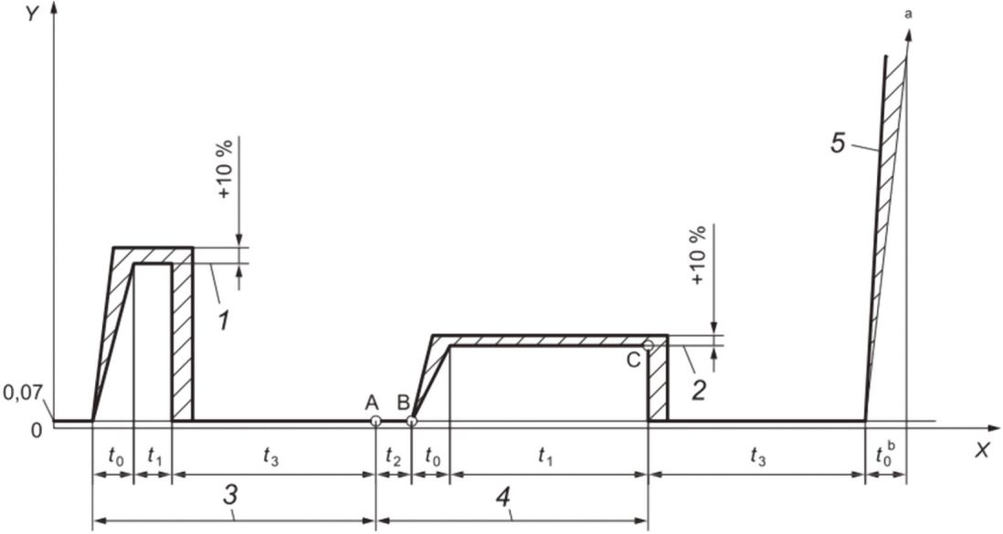 X - время t; Y - давление p (МПа или бар); 1 - проверочное