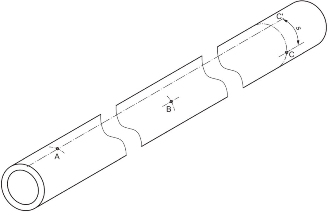 Измеряют начальную длину и диаметр/окружность и наносят контрольные метки для измерения скручивания между точками A и B. Измеряют увеличение длины, диаметра/окружности, скручивание и деформацию непосредственно перед точкой C.