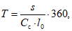 Вычисляют степень скручивания рукава T в градусах на метр по формуле