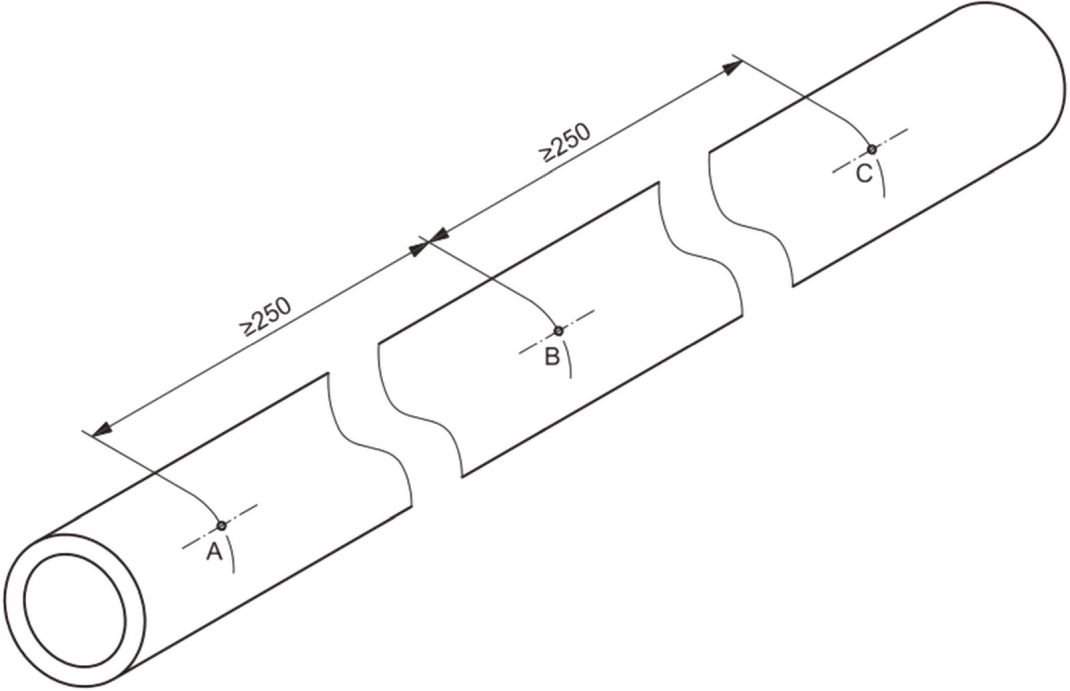 6.2), сохраняя давление, наносят три контрольные метки (A, B и C), среднюю метку (B) наносят примерно на середине длины рукава, крайние метки (A и C) - на расстоянии не менее 250 мм от середины рукава (метка B). Каждая метка должна быть в виде дуги по окружности рукава, через которую проходит прямая линия, перпендикулярная к дуге, при этом три линии должны быть коллинеарными (см.