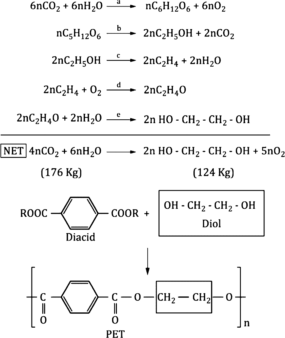 В случае биополиэтилентерефталата, который частично (около 30%) получен из биологического сырья, из воздуха поглощается 1,42 кг CO2 на 1 кг биомоноэтиленгликоля (bio-MEG). Кроме того, из воздуха поглощается 0,46 кг CO2 на 1 кг биополиэтилентерефталата.