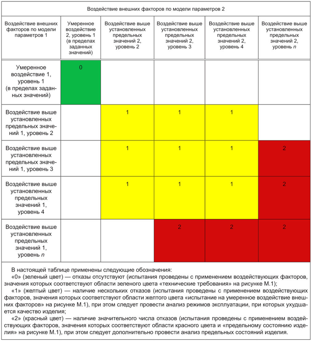 рисунок M.1, область желтого цвета). Как правило, ускоренные испытания проводят для получения информации о частном, сравнительно простом механизме ухудшения качества изделия (или соответствующем методе ухудшения качества). При наличии более одного режима эксплуатации, при котором происходит ухудшение качества изделия, скорости разных механизмов ухудшения качества могут быть различными. Если это не будет учтено при моделировании испытания и анализе его результатов, то экстраполяция результатов может быть выполнена неправильно;