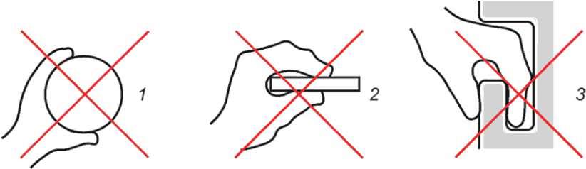 Поверхность обхвата лестничного поручня не должна перекрываться стойками, креплениями, чтобы при движении руки по поручню не удариться о них пальцами. Рука должна свободно размещаться между поручнем и стеной, чтобы избежать опасности пораниться о неровности стены или удариться (см.