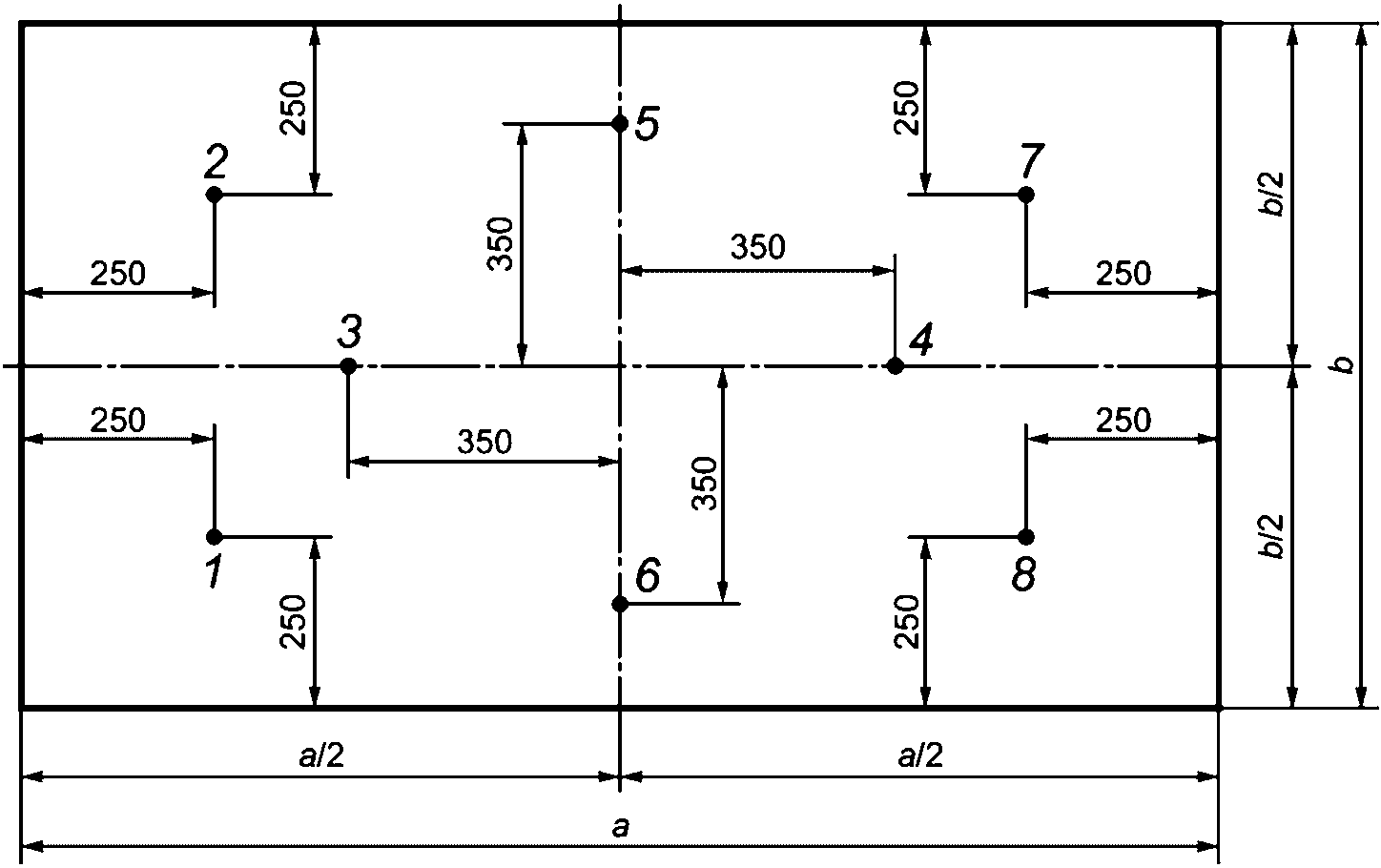 a - длина мата; b - ширина мата; 1 - 8 - точки измерения