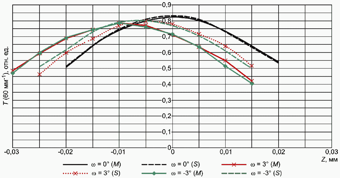 рисунке В.2 - расфокусировочные кривые коэффициента передачи модуляции для пространственной частоты 60 мм
