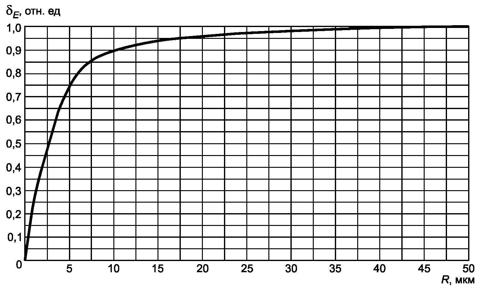 : Зависимость коэффициента концентрации энергии, отн. ед. или %, от координаты, мкм, в изображении малоразмерного точечного объекта.