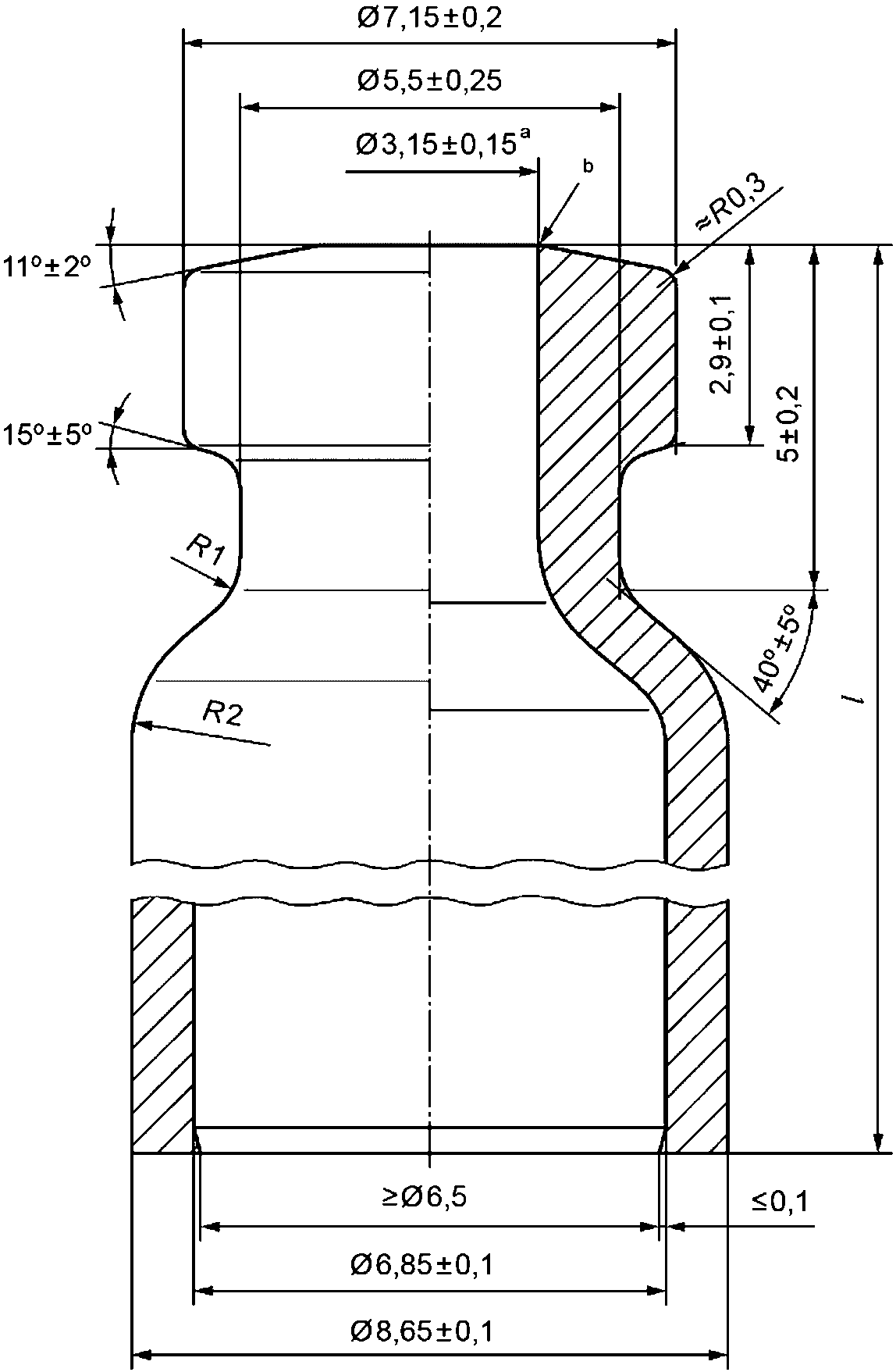 - коническая часть горловины цилиндра имеет высоту, равную длине горловины (5,0 +/- 0,2) мм;