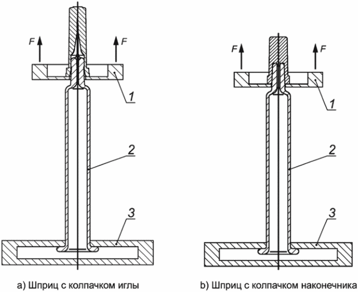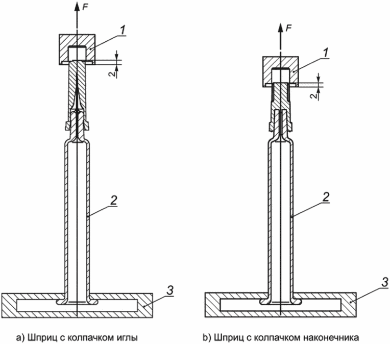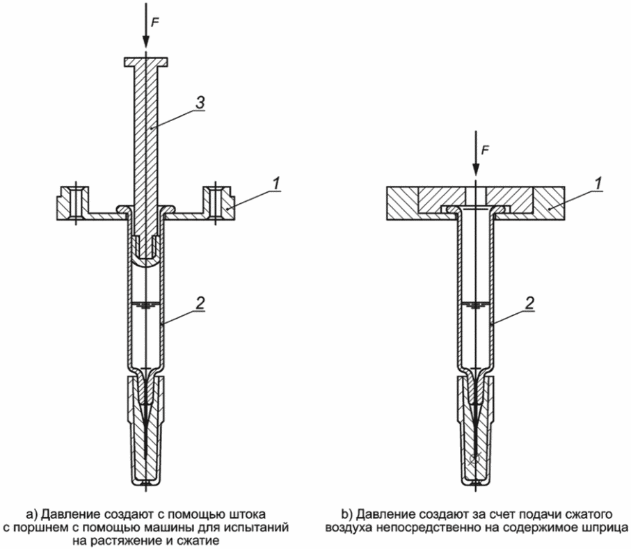 H.4.4 Создают один или несколько образцов положительного контроля протекания, путем создания доступа окрашенной жидкости к содержимому шприца (например, поместив иглу для инъекций или аналогичное устройство между наконечником шприца и соответствующим укупорочным средством, или, при наличии колпачка иглы, его сниманием).