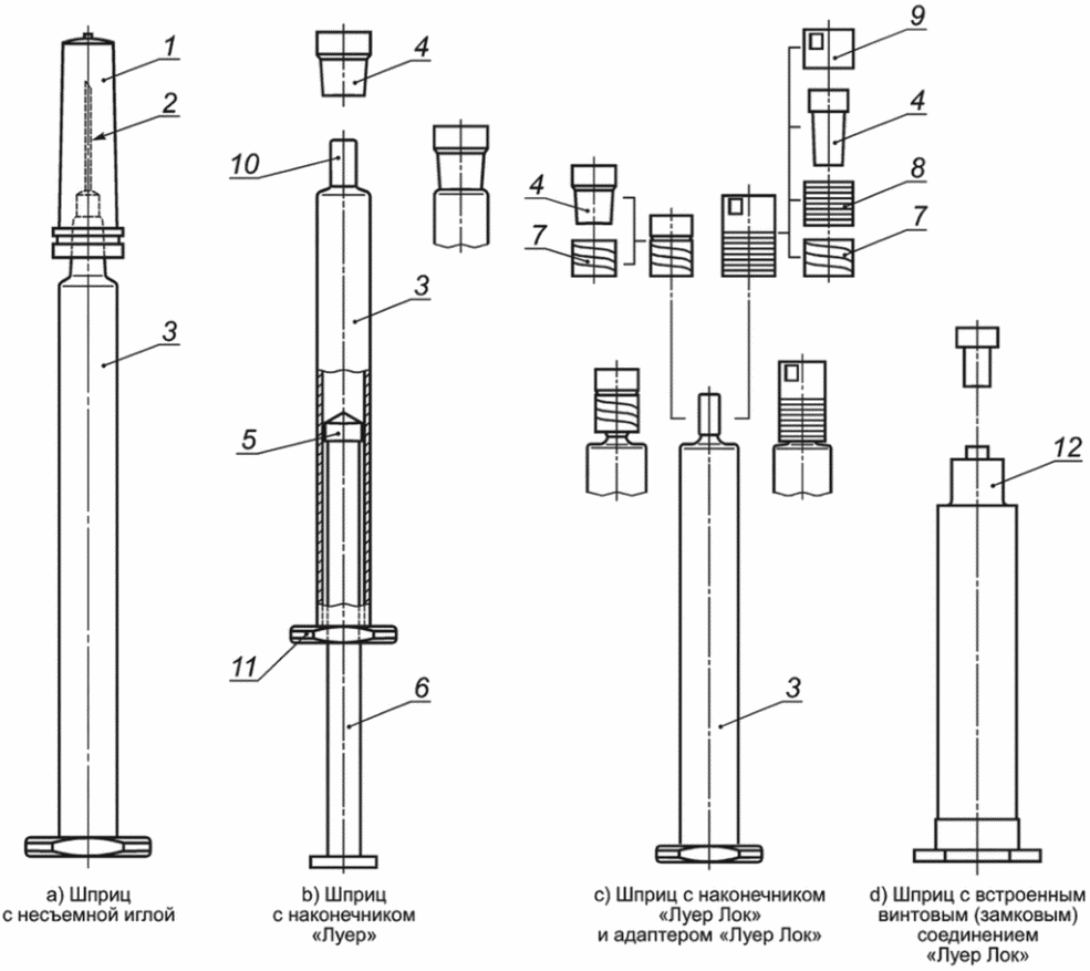3.1.8 укупорочная система шприца (syringe closure system): Компонент или многокомпонентная система, предназначенная для укупорки шприцевой системы со стороны наконечника, обеспечивающая стерилизацию наконечника и сохранение стерильности содержимого шприца до момента инъекции.