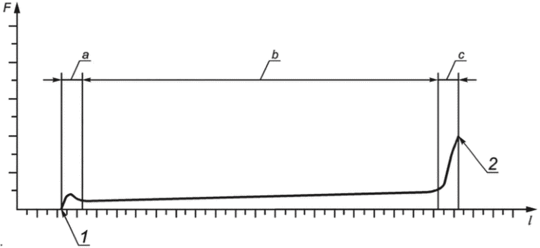 G.6.2.4.5 Регистрируют зависимость величины усилия от достигнутого расстояния перемещения устройства растяжения (траверсы).