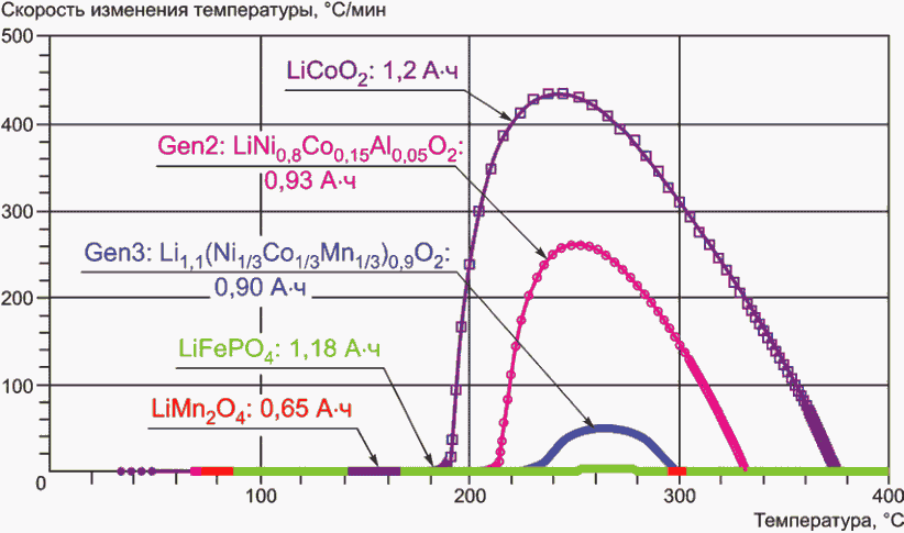 1 Основным преимуществом литий-ионных железофосфатных электродов является их пассивная безопасность. Под пассивной безопасностью подразумевается наличие определенных свойств самого аккумулятора, проявляемых им даже при отсутствии электронных (активных) компонентов безопасности. Пассивная безопасность ЛЖФА является следствием низкой вероятности теплового разгона при заряде (перезаряде) или физическом разрушении.