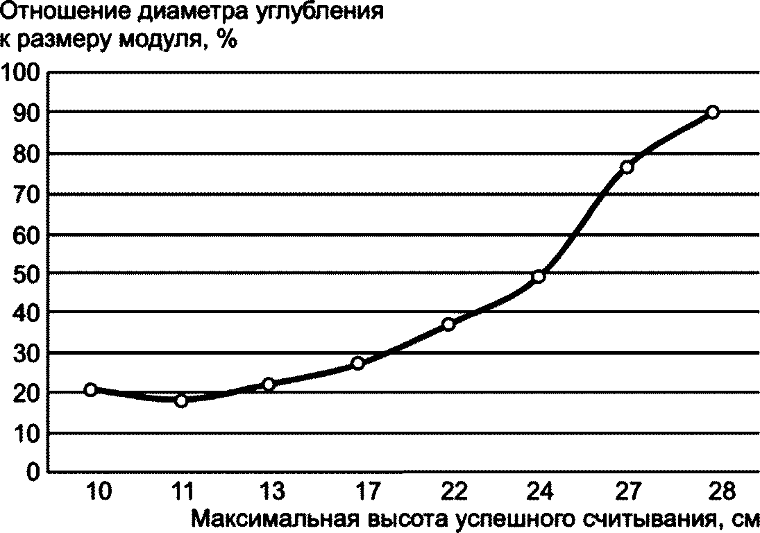 N | Диаметр углубления (точки), мкм | Размер модуля, мкм | Отношение диаметра углубления к размеру модуля, % | Результат считывания с расстояния 10 см (1 попытка) |