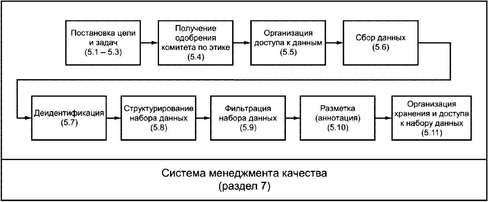 С целью повышения доступности и качества данных, необходимых для развития технологий искусственного интеллекта в сфере здравоохранения, в данном стандарте представлена унифицированная методология подготовки и использования набора данных, общая схема которого отображена на