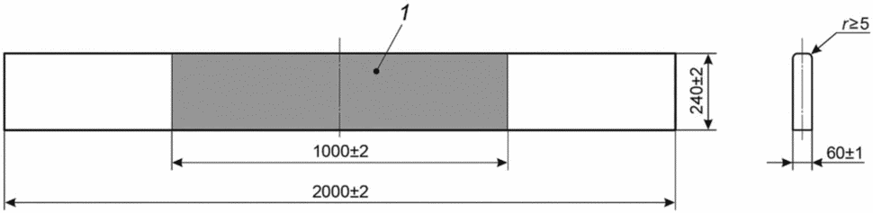 Доска упора должна быть прямой. Боковые торцы доски должны иметь узлы для соединения с боковыми опорами. Нижняя часть доски должна быть ровной, без закруглений. На доске упора с двух боковых сторон должна быть нанесена разметка центральной зоны шириной (1000 +/- 2) мм. Верхняя часть кромки доски должна иметь радиус закругления не менее 5 мм. Доски упора изготовляют длиной (2000 +/- 3) мм, высотой (240 +/- 2) мм, толщиной (60 +/- 1) мм. Схема доски упора показана на рисунке 2.