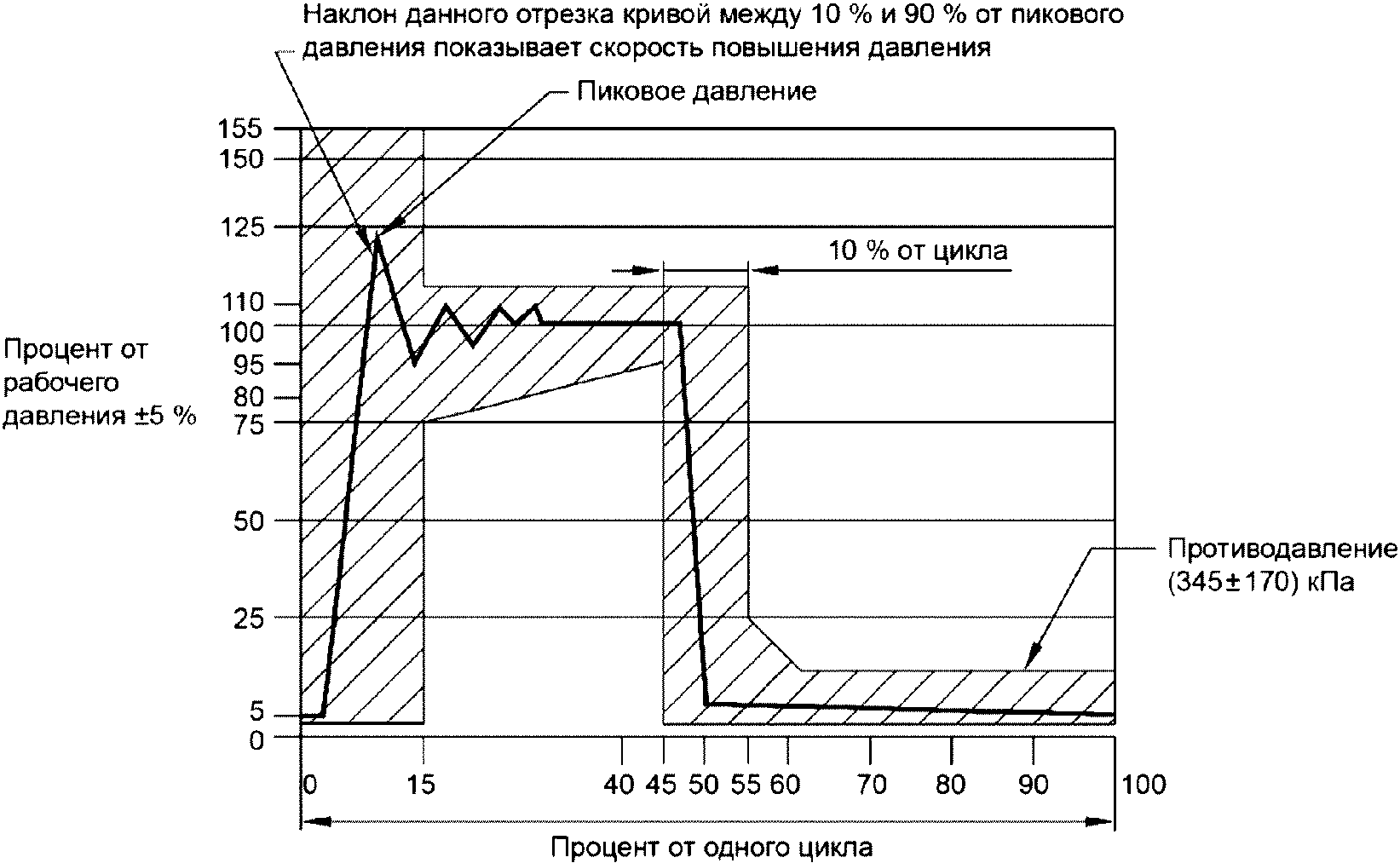 Форма кривой импульса фактического давления в трубопроводе во время испытания должна находиться в пределах заштрихованной области, показанной на