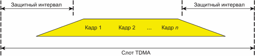 При использовании этой схемы передача организована через слоты TDMA. Слот представляет собой последовательность сформированных физических кадров, окруженную с обеих сторон защитными интервалами, вводимыми для предупреждения наложения данных соседних слотов из-за временной рассинхронизации передатчиков и размытия сигналов вследствие фильтрации. Длина последовательности кадров и длительности защитных интервалов определяются частотно-временным планом. Структура слота TDMA приведена на