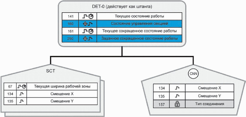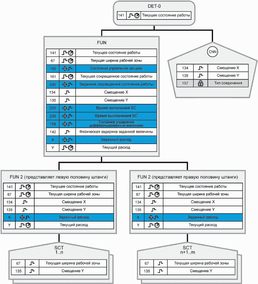 рисунке F.43. В этом примере рекомендуется использовать информацию о расходе и ширине рабочей зоны. Корневой элемент устройства представляет собой штангу устройства. Расположение элементов устройства "Бункер" в качестве дочернего элемента штанги указывает на то, что продукт из этого бункера распределяется через эту штангу. Не допускается иметь одинаковый DDI расхода, прикрепленный как к корневому элементу устройства, так и к элементу "Бункер". Жизненный цикл общего времени в корневом элементе устройства является обязательным, и жизненный цикл общего DDI расхода должен располагаться в том же элементе устройства, который имеет фактический DDI расхода.
