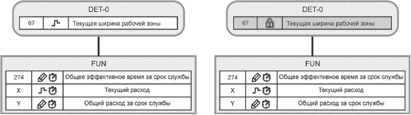 Вместо общего элемента устройства "Функция", в качестве атрибутов элемента устройства "Бункер" также могут быть заданы значения DDI расхода и связанные с ними итоговые значения за срок службы. Два примера этих пулов объектов дескрипторов устройств приведены на