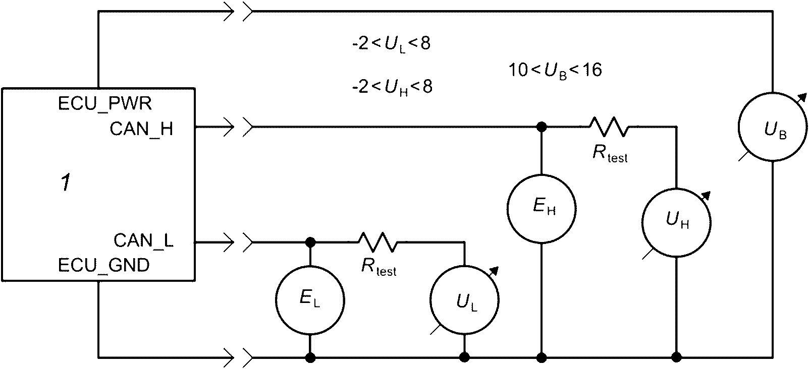 Диапазон напряжений шины определяется максимальным и минимальным допустимыми уровнями напряжения CAN_H и CAN_L, измеряемыми относительно ECU_GND каждого ECU, для которого гарантируется правильная работа, когда все ECU подключены к сигнальным линиям шины.
