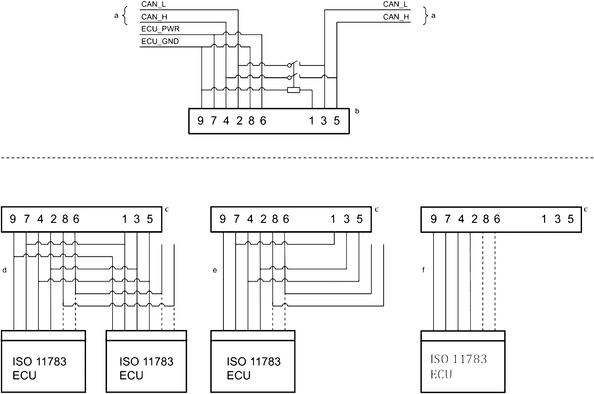 Разъем шлейфа ECU является опциональным соединителем, используемым для присоединения ECU к его шлейфу на сегменте шины ИСО 11783. Через этот соединитель следует передавать только сигналы CAN_H и CAN_L.