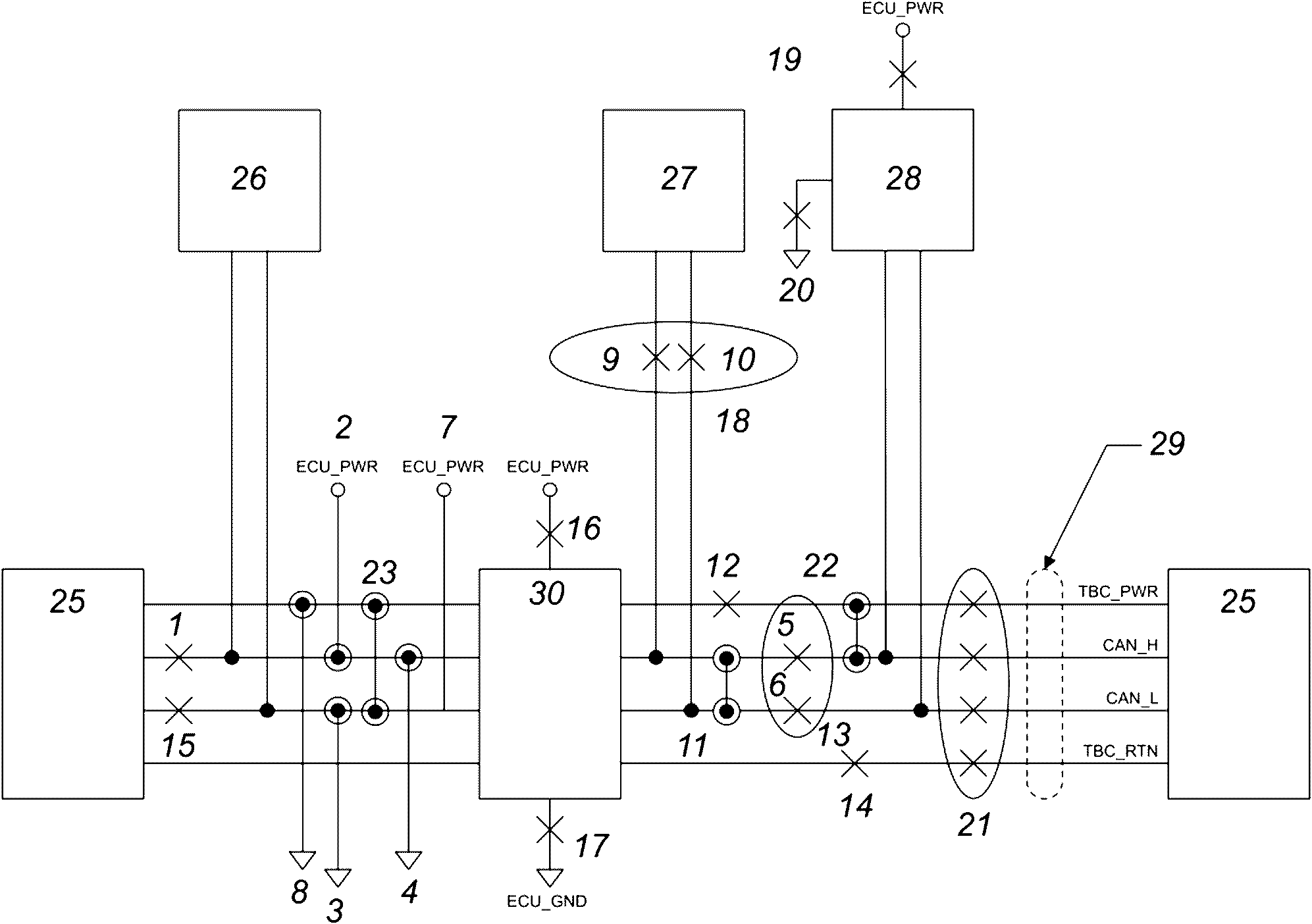 a) TQPL: состоит из четырех проводников, два из которых, обозначенные CAN_H и CAN_L, проводят информационные сигналы. Названия выводов ECU, соответствующих этим проводникам, также обозначаются CAN_H и CAN_L. Третий и четвертый проводники, обозначенные TBC_PWR и TBC_RTN, обеспечивают питание оконечных схем (TBC) на сегментах шины.