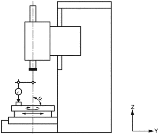 Замечания и ссылки на ИСО 230-1:2012, пункт 8.2 Перемещают салазки держателя инструмента по центру стола. Угольник (не цилиндрический), горизонтальное плечо которого располагается параллельно оси X, устанавливают на столе в радиальном направлении на одной стороне салазок держателя инструмента таким образом, чтобы можно было повернуть стол на 90° и перемещать угольник от плоскости ZX к плоскости YZ, не мешая салазкам держателя инструмента. Выравнивание угольника по оси C не требуется. Снимают показания индикатора с круговой шкалой в различных положениях по оси Z. Если необходимо совместить это испытание с испытанием по схеме G8, устанавливают угольник в такое положение, чтобы можно было повернуть стол четыре раза, каждый раз поворачивая его на 90°. Эти условия проведения испытаний также можно применять к испытаниям по схеме G8, G9 и G11. | ||
