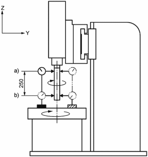 Замечания и ссылки на ИСО 230-1:2012, пункт 12.5.3 Индикатор с круговой шкалой крепят к столу (шпиндель для крепления обрабатываемой заготовки) и вставляют контрольную оправку в инструментальный шпиндель с приводом. Устанавливают измерительный преобразователь смещения как можно ближе к позиции a), вращают инструментальный шпиндель и записывают показания. Повторяют операцию в позиции b). Если на станке установлено несколько инструментальных шпинделей, эти испытания проводят для каждого шпинделя (см. также испытание по схеме AR2). | ||