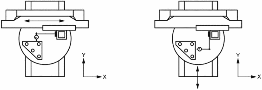 Замечания и ссылки на ИСО 230-1:2012, пункт 10.1.4 Контрольную оправку устанавливают на инструментальный шпиндель. Если возможно, зажимают шпиндель для крепления обрабатываемой заготовки. a) Индикатор с круговой шкалой закрепляют на шпинделе для крепления обрабатываемой заготовки, снимая показания по оправке в направлении оси Y. Среднее направление оправки определяется путем вращения инструментального шпинделя между двумя крайними показаниями измерительного преобразователя смещения. Когда оправка занимает среднее направление, измерительный преобразователь смещения выставляют на ноль. Затем салазки держателя инструмента перемещают на другой конец длины измерения хода и записывают показания измерительного преобразователя смещения. b) Индикатор с круговой шкалой закрепляют на шпинделе для крепления обрабатываемой заготовки, снимая показания по оправке в направлении оси X. Среднее направление оправки определяется путем вращения инструментального шпинделя между двумя крайними показаниями измерительного преобразователя смещения. Когда оправка занимает среднее направление, измерительный преобразователь смещения выставляют на ноль. Затем салазки держателя инструмента перемещают на другой конец длины измерения хода и записывают показания измерительного преобразователя смещения. Отклонение параллельности - разность между двумя усредненными показаниями, снятыми только в конечных точках (при 0° и 180°), деленная на пройденное расстояние. В качестве альтернативы используют угловой коэффициент прямой по среднему значению двух измерений (при 0° и 180°). Примечание - Дальнейшие испытания для проверки точности осей вращения определены в приложении A. | ||