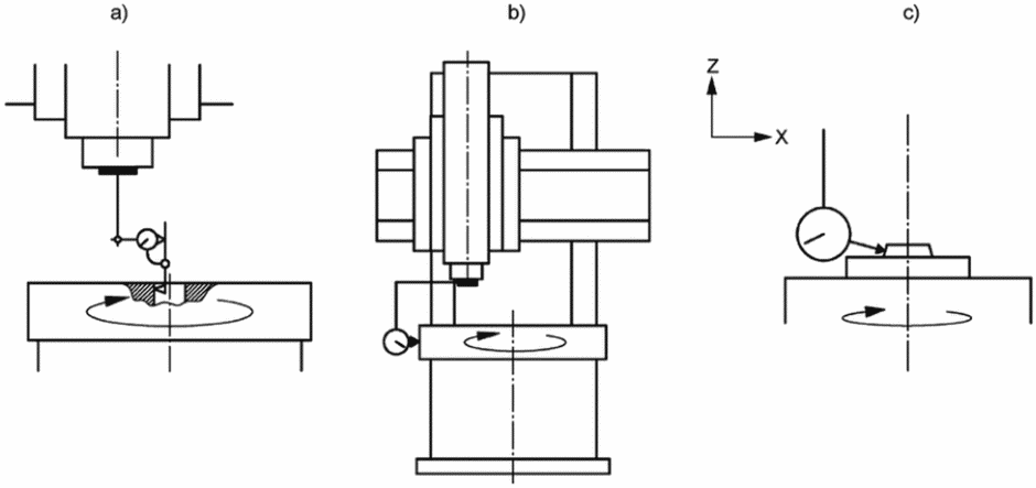 Проверка биения: a) центрирующего отверстия стола для крепления обрабатываемой заготовки; b) наружной цилиндрической поверхности стола для крепления обрабатываемой заготовки (если стол для крепления обрабатываемой заготовки не имеет центрального отверстия); c) центрирующего диаметра шпинделя для крепления обрабатываемой заготовки. | ||||