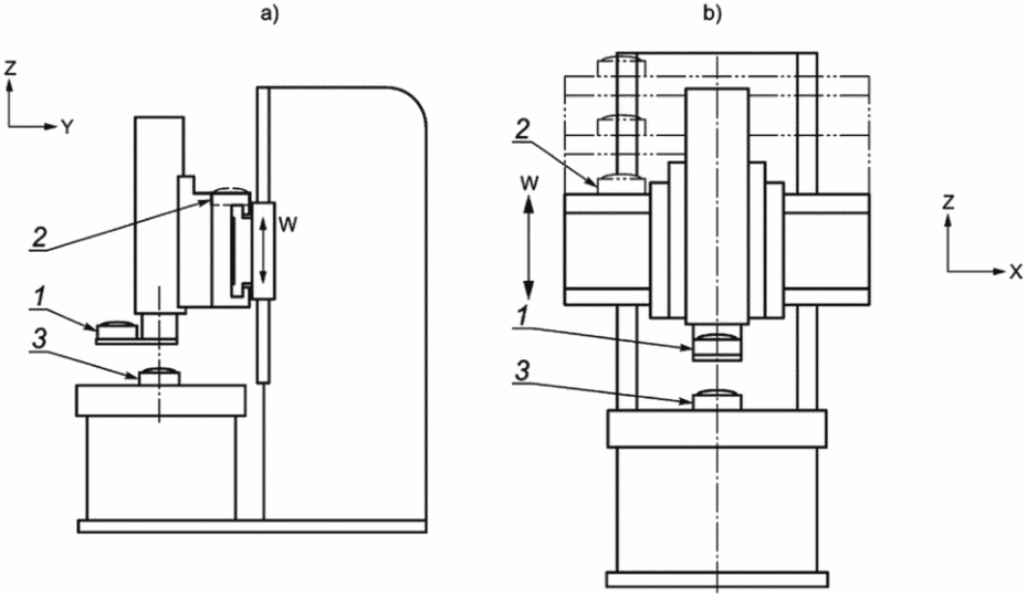 Замечания и ссылки на ИСО 230-1:2012, пункт 12.5 a) и b) - индикатор с круговой шкалой устанавливают в положении приблизительно 180° к положению инструмента в условиях обработки стола для крепления заготовки. Положение поперечины, суппорта и салазок блокируется по возможности. Индикатор с круговой шкалой устанавливают на держатель инструмента в положение, близкое положению инструмента. c) См. ИСО 230-1:2012, пункт 12.5.2. На конической поверхности наконечник индикатора с круговой шкалой следует устанавливать перпендикулярно к поверхности касания. | ||||