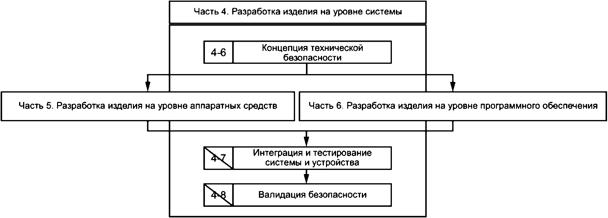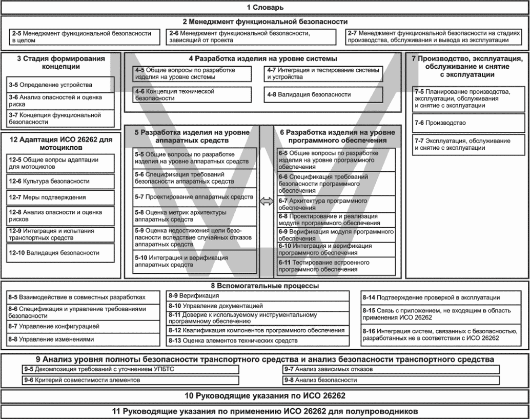 рисунке B.1 конкретные разделы каждой части ИСО 26262 указаны следующим образом: "m-n", где "m" представляет собой номер части ИСО 26262, а "n" указывает на номер раздела этой части, например 3-6 - это раздел 6 ИСО 26262-3.