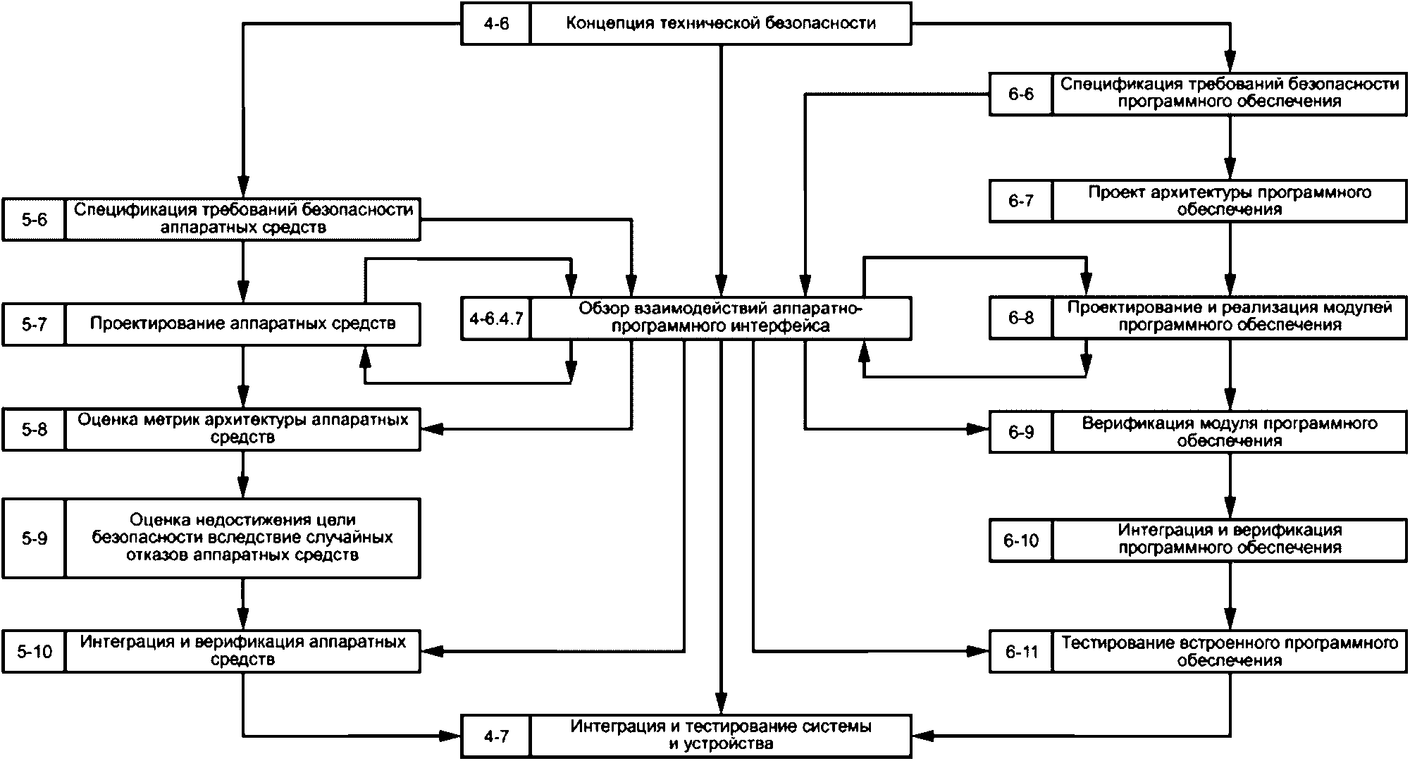 7 Интеграция и тестирование системы и устройства | a) определить последовательность действий по интеграции и интегрировать элементы системы до полной интеграции системы; b) удостовериться в том, что определенные меры безопасности, полученные в результате анализа безопасности на уровне архитектуры системы, выполнены надлежащим образом; c) предоставить доказательства того, что элементы интегрированной системы удовлетворяют их требованиям безопасности, которые соответствуют архитектуре системы | Цели безопасности из отчета по анализу безопасности и оценке риска (см. 6.5.1 ИСО 26262-3). Концепция функциональной безопасности (см. 7.5.1 ИСО 26262-3). Концепция технической безопасности (см. 6.5.2). Спецификация архитектуры системы (см. 6.5.3). Технические требования к аппаратно-программному интерфейсу (см. 6.5.4) | 7.5.1 Стратегия интеграции и тестирования в результате выполнения требований 7.4.1. 7.5.2 Отчет по интеграции и тестированию в результате выполнения требований 7.4.2 - 7.4.4 |