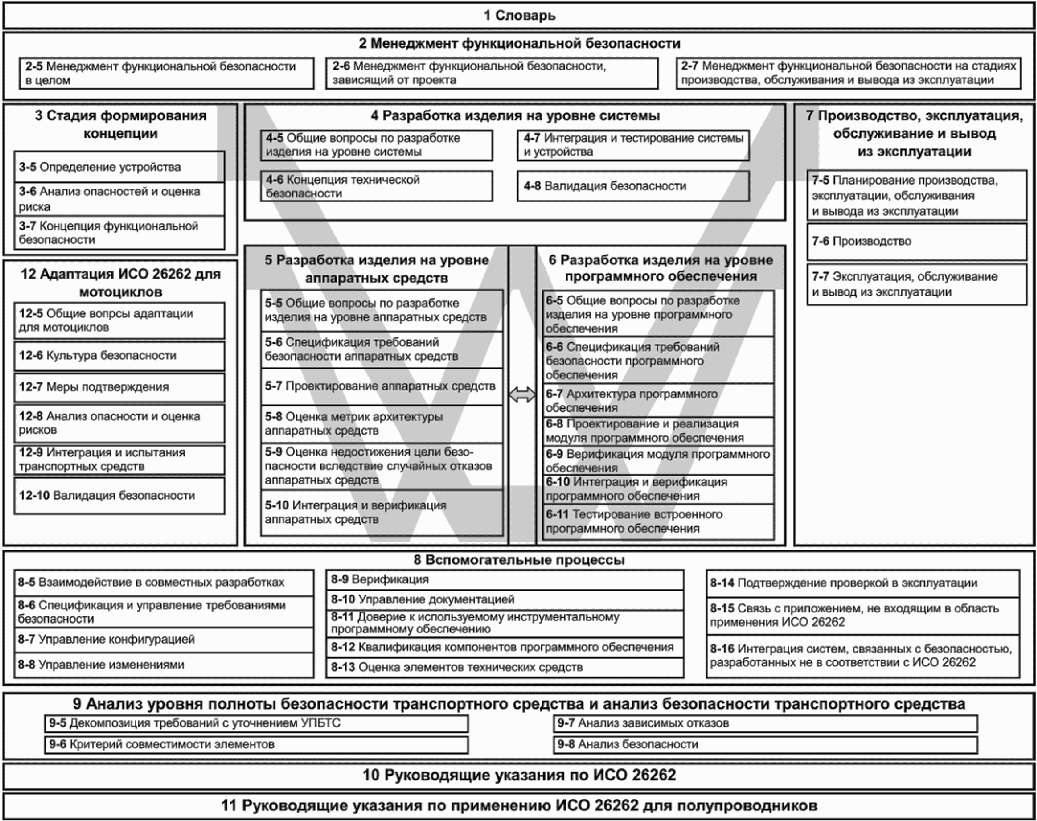 рисунке 1 показана общая структура серии стандартов ИСО 26262. В нем для различных стадий разработки изделия используют эталонную V-модель процесса. На