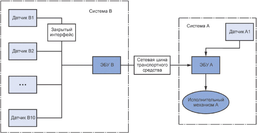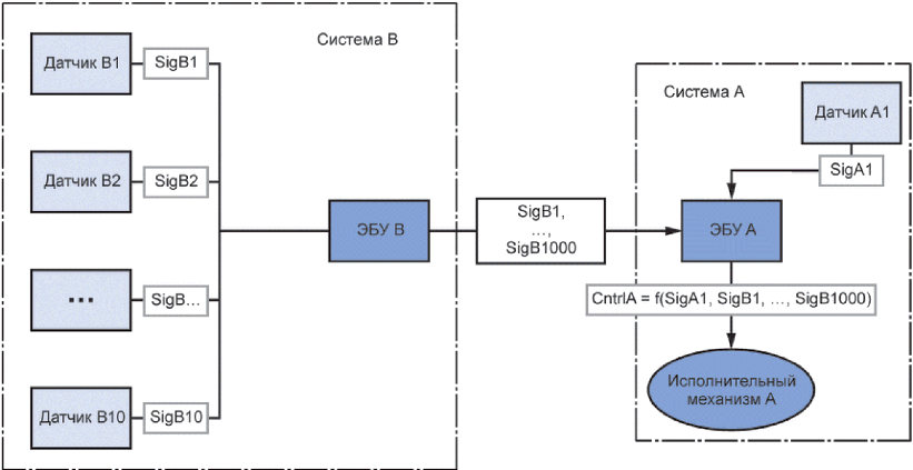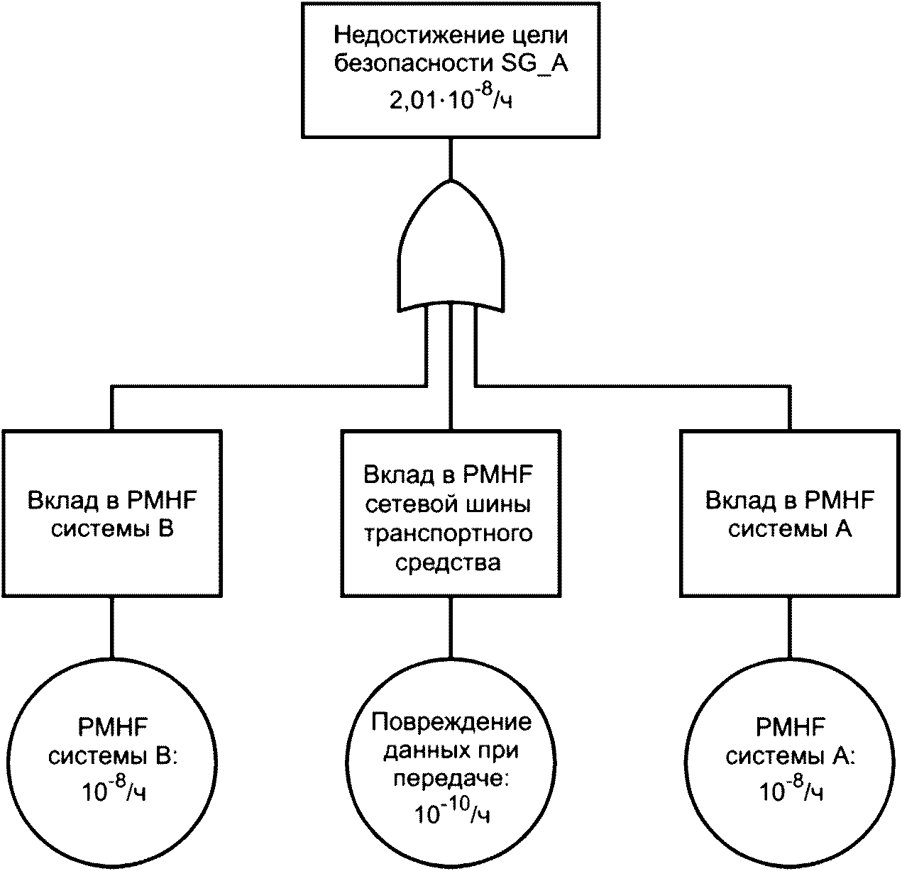 Примечание - Поскольку каждый из 1000 сигналов, подаваемых системой B, может привести к недостижению цели безопасности SG_A и поскольку система A не может проверить корректность этих сигналов, то может возникнуть желание распределить значение PMHF системы B между всеми сигналами поровну, что приведет к значению PMHF 10-8/1000/ч = 10-11/ч на сигнал. В этом случае требование безопасности, направляемое поставщику системы A, может быть сформулировано следующим образом: "Предотвратить выход некорректного значения сигнала Bx(УПБТС D, PMHF_SigBx <= 10-11/h, SPFM >= 99%, LFM >= 90%) для x = 1, ..., 1000". Однако при вычислении общего значения PMHF для системы B считается, что эти сигналы имеют общие элементы аппаратных средств (например, ЭБУ B), вносящие вклад в их интенсивности отказов, делая эти отказы зависимыми друг от друга. В этом примере на каждый сигнал могут влиять сбои в ЭБУ B. Это означает, что сбои в ЭБУ B могут повредить от 1 до 1000 сигналов. Если интенсивность остаточных отказов каждого сигнала суммируется без учета этого факта, то эта сумма может быть выше, чем базовая интенсивность отказа всей системы B. Поэтому такой подход не может быть использован.