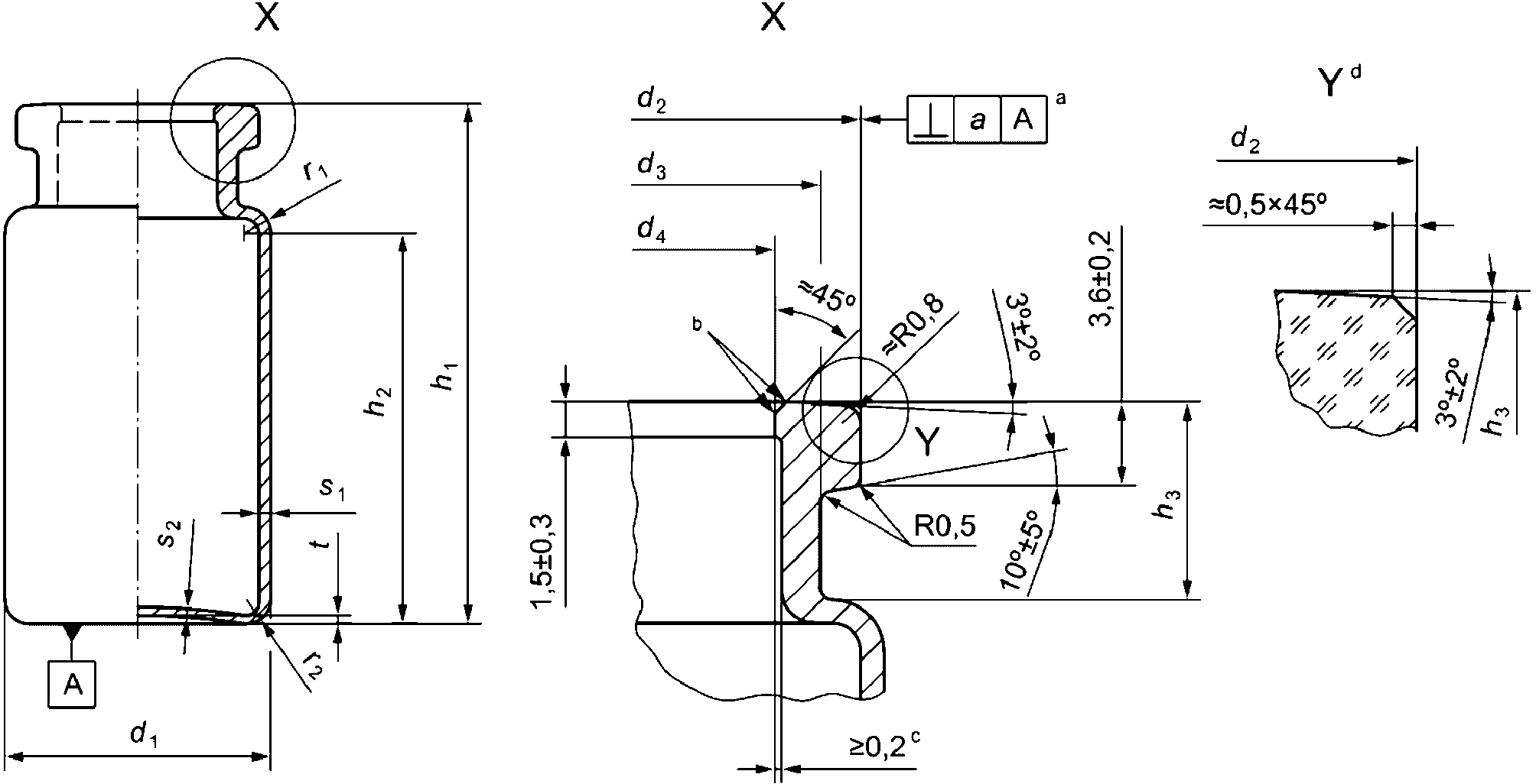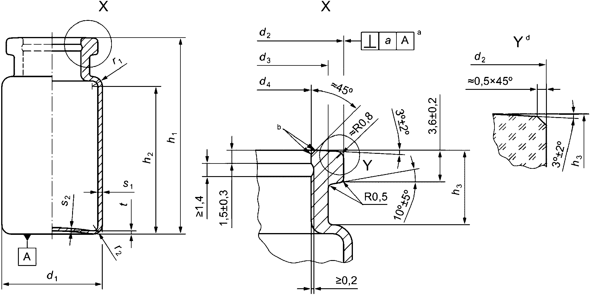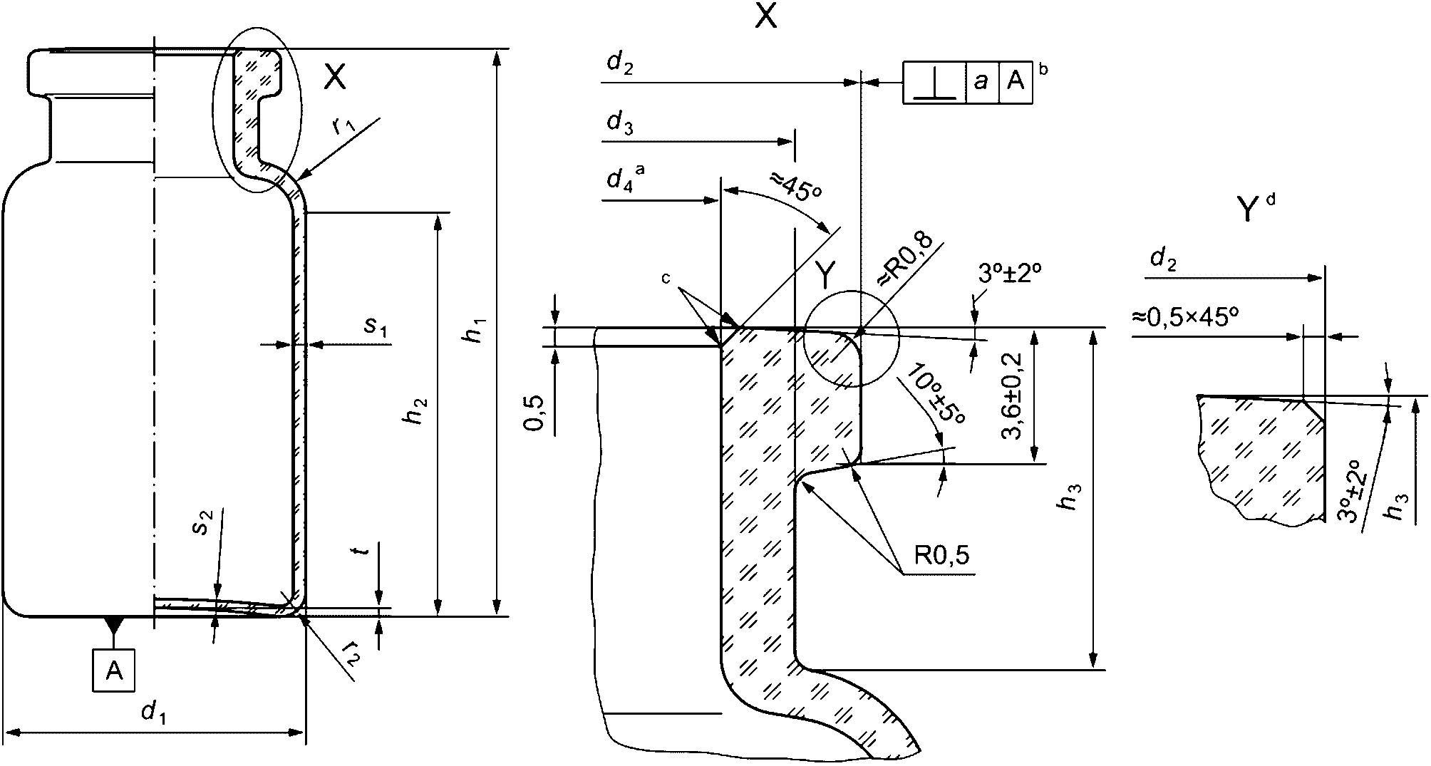 <a> Допуск перпендикулярности a (согласно определению в ИСО 1101) является предельным значением отклонения перпендикуляра, проходящего через центр нижней части флакона и ось флакона по верхнему краю фланца; измеряется по кромке.