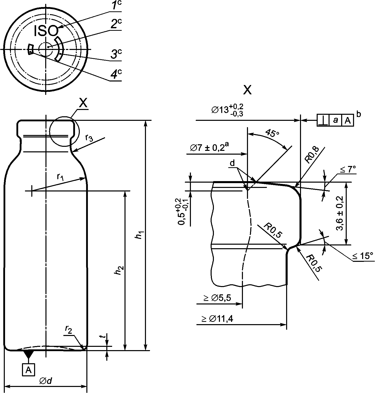 <b> Допуск перпендикулярности a (как определено в ИСО 1101) представляет собой предел отклонения перпендикуляра, проходящего через центр нижней части и ось флакона по верхней кромке фланца. Измеряется по верхнему краю.