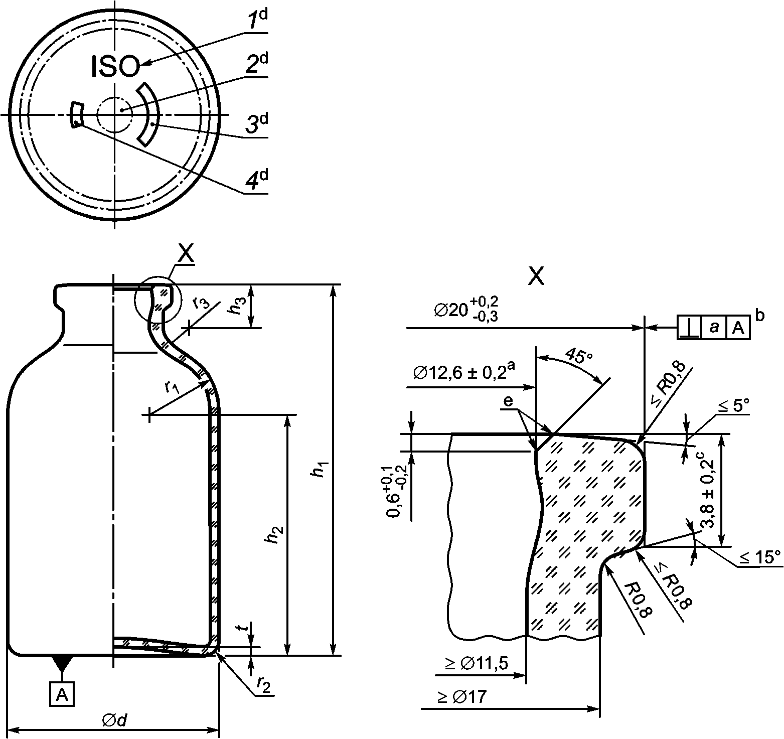 Обозначение размера флакона для инъекционных лекарственных форм | Максимальный объем, мл, мин. | a | d | h1 | h2 | h3 | | | | t |