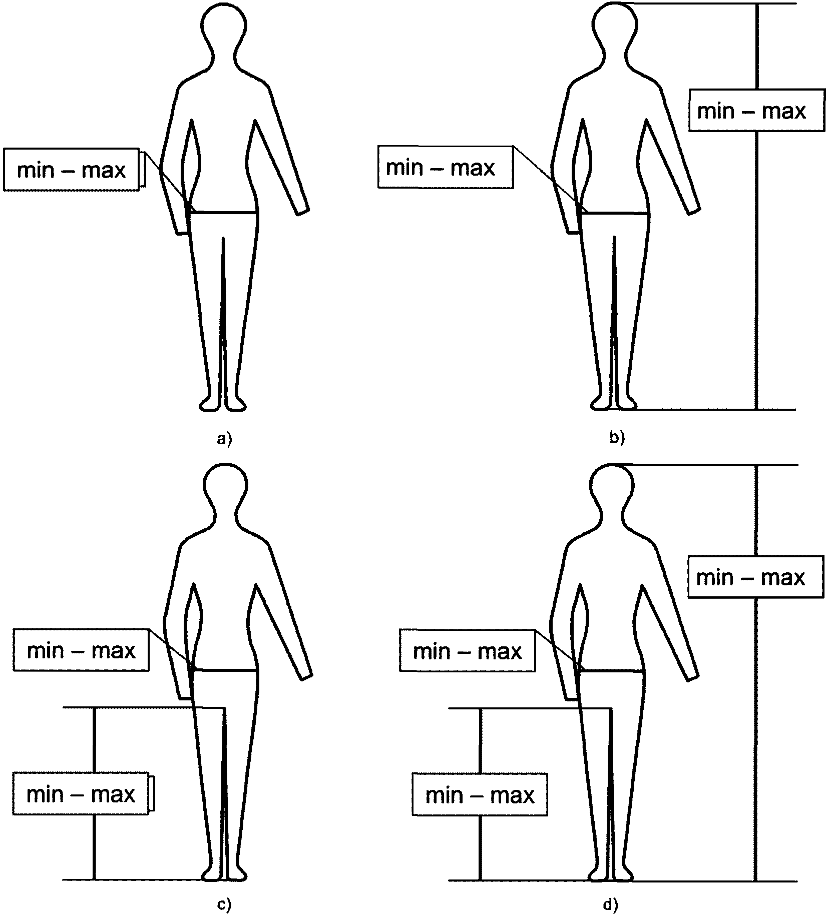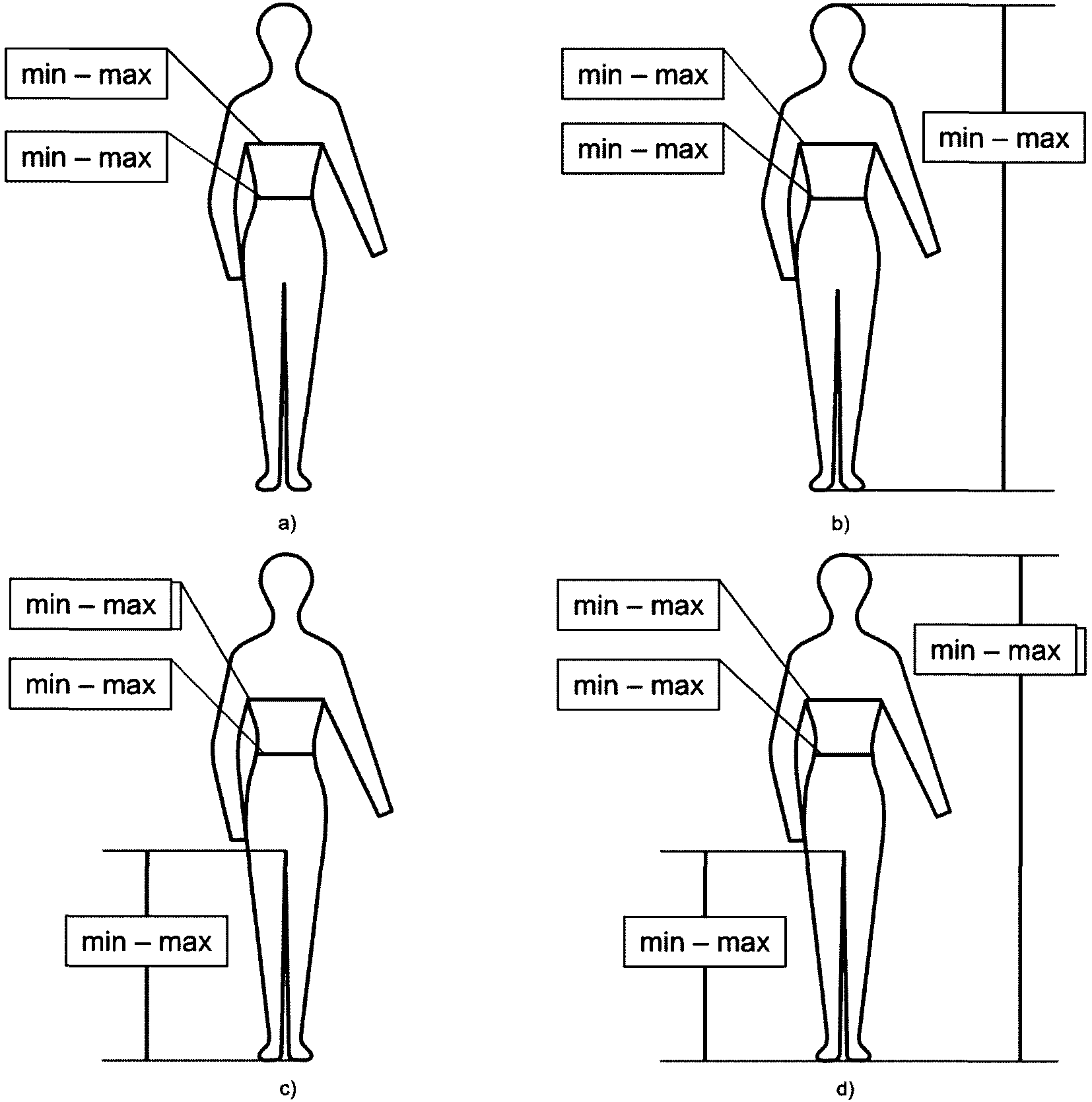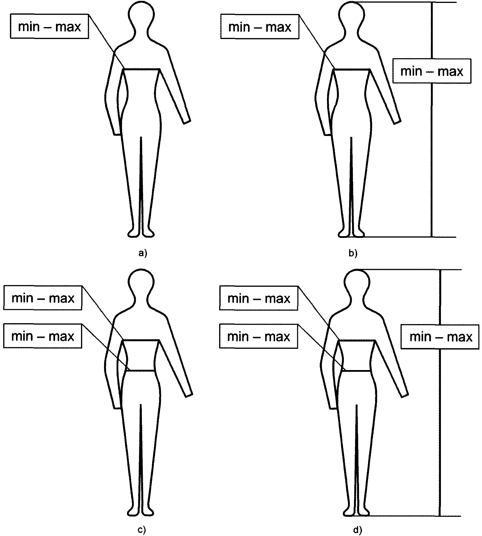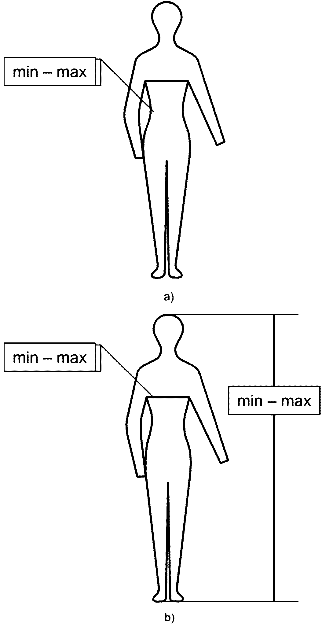 Если вместо стандартной пиктограммы используют аналогичное графическое изображение (например, силуэт тела человека), необходимо предоставить информацию, связанную с диапазоном(ами) измерения(й) тела и с расположением соответствующих им измерений.