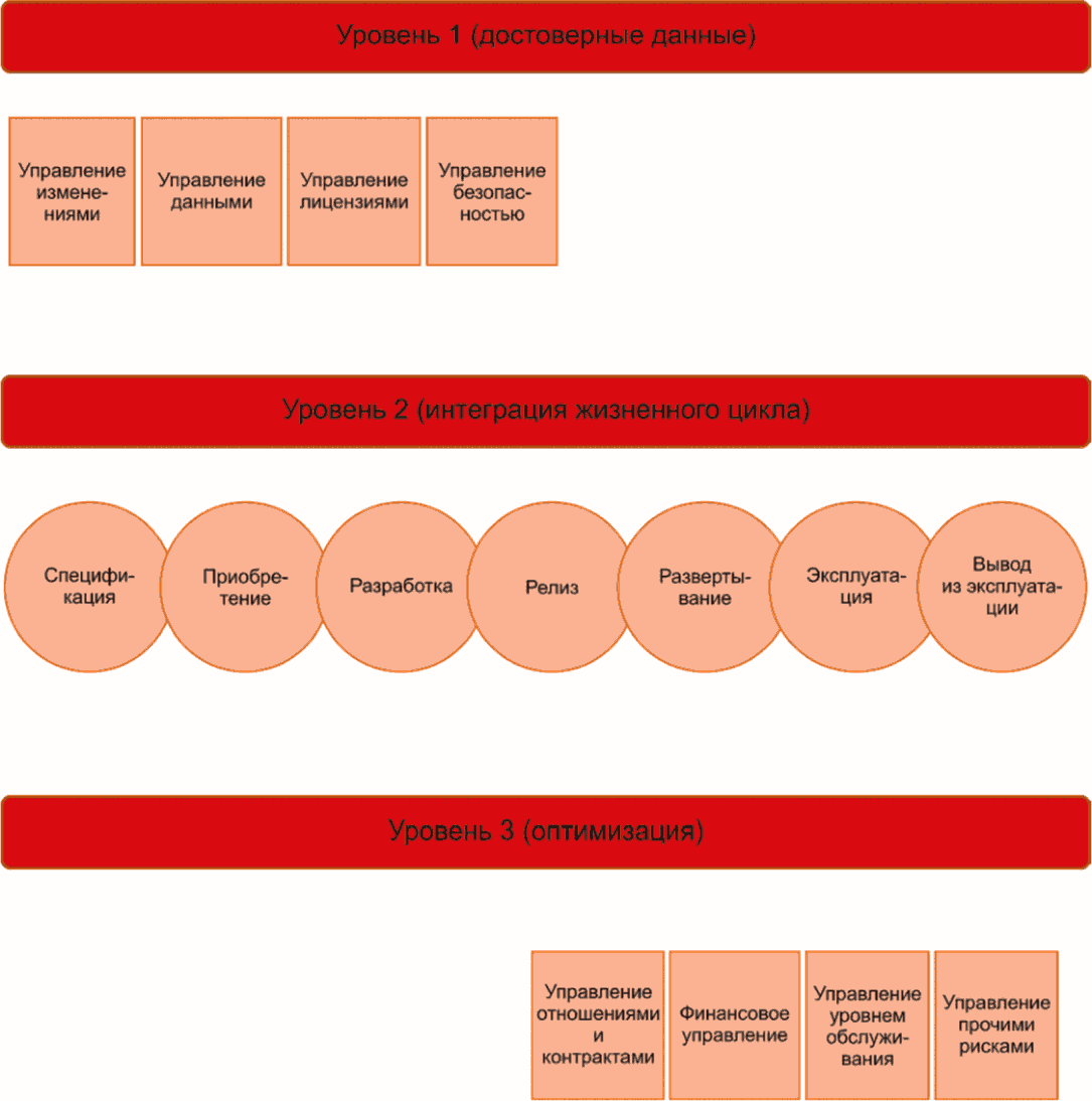 приложения A, определенные для упрощения ссылок. Уровни необязательно отражают последовательность, в которой процессы внедряются. Они были созданы в ответ на отзывы рынка о том, что многие организации, особенно малые, не смогли реалистично полностью внедрить все операционные процессы, но хотели что-то, что даст разумную гарантию того, что организация сможет достичь и поддерживать лицензионное соответствие программного обеспечения, даже если не будут достигнуты все другие потенциальные выгоды от хорошего SAM и ITAM.