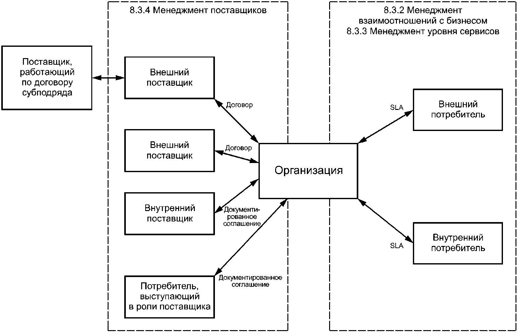 Организация не может демонстрировать соответствие требованиям, указанным в настоящем стандарте, если другие стороны используются для предоставления или осуществления всех сервисов, их компонентов или процессов в области СМС.