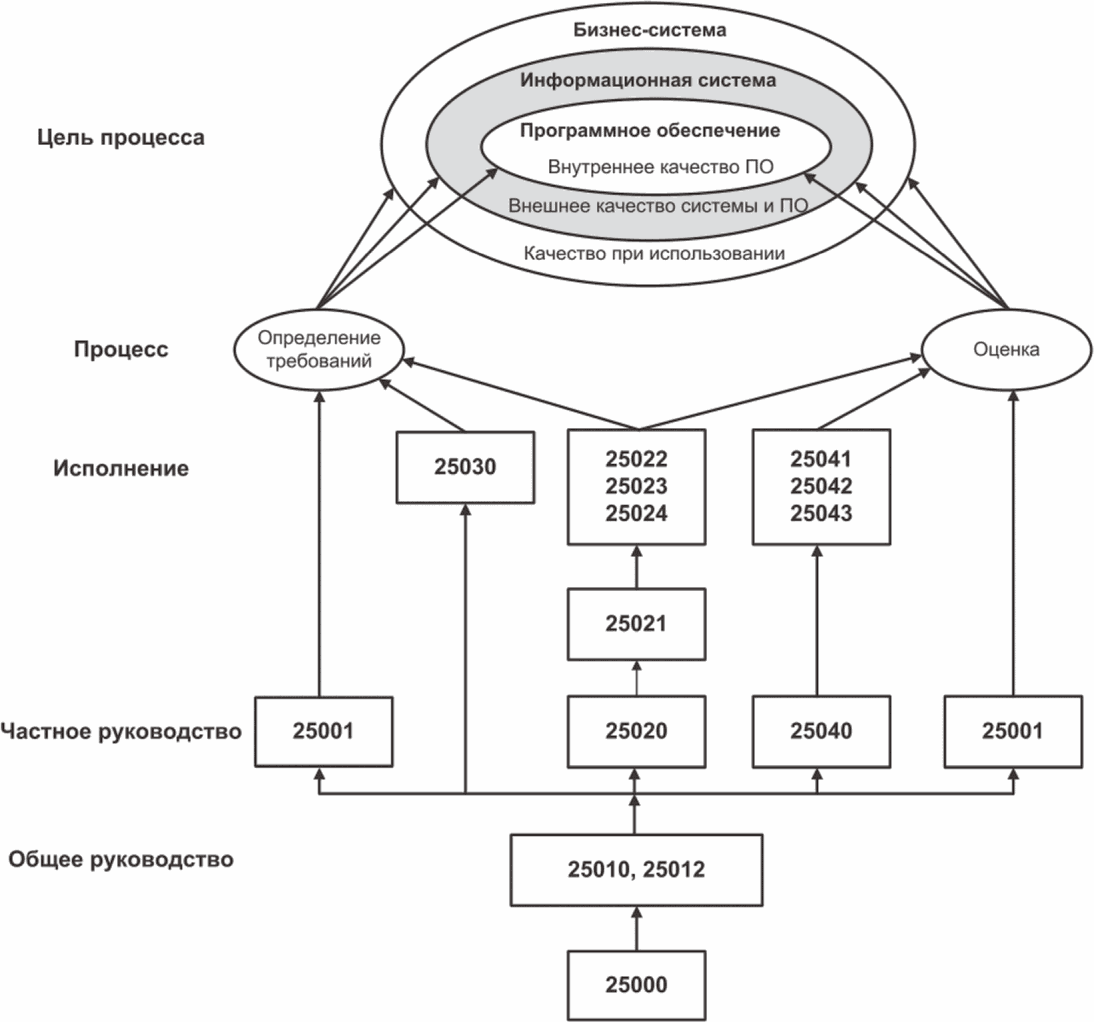 - стандарты для определения требований, планирования и управления, измерения и оценки качества.