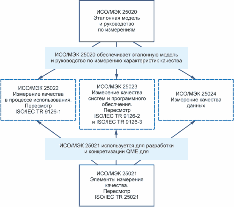 - ИСО/МЭК 25020 - Эталонная модель и руководство по измерениям: обеспечивает эталонную модель и руководство по измерению характеристик качества, определенных в ИСО/МЭК 2501n;