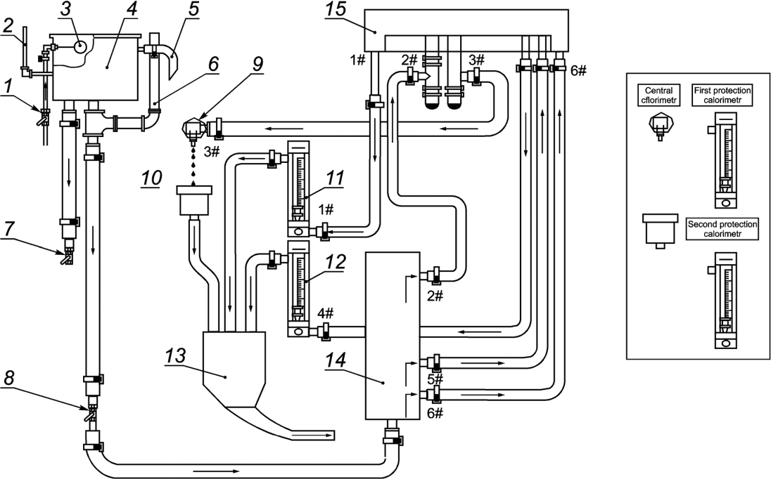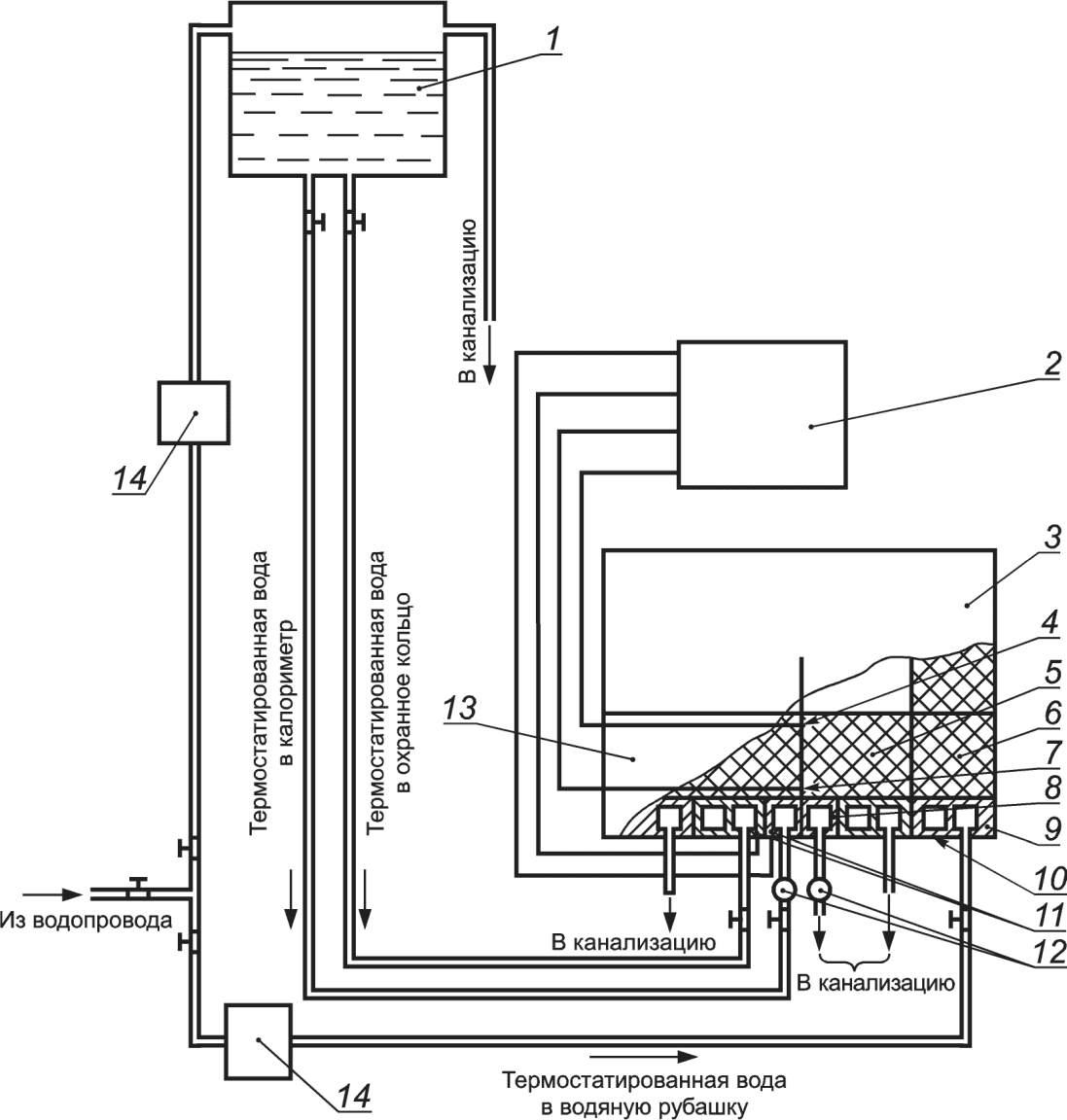 9.4 Регулируют температуру воды в калориметре, охранном кольце и водяной рубашке при помощи регулирующего устройства, а также путем изменения расхода воды, проходящей через охранное кольцо и водяную рубашку.