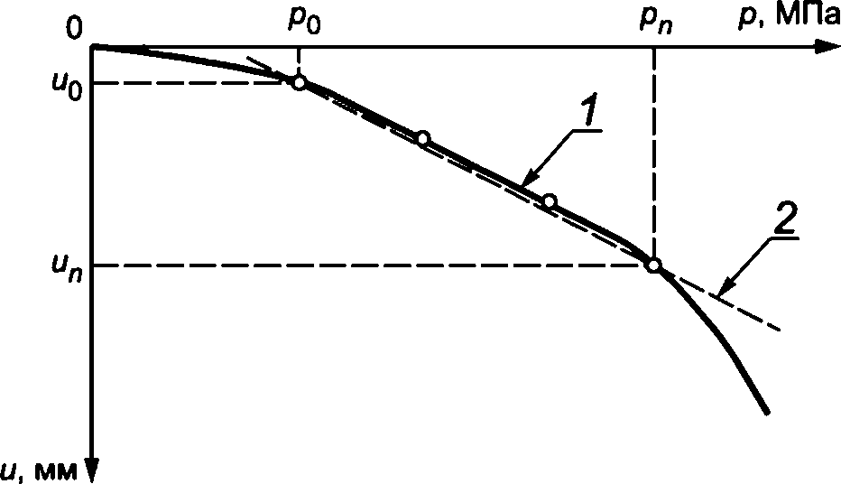 Через нанесенные на график четыре точки проводят осредняющую прямую методом наименьших квадратов или графическим методом. За начальные значения p0 и u0 (первая точка, включаемая в осреднение) принимают значения p и u, соответствующие бытовому давлению на отметке испытаний.