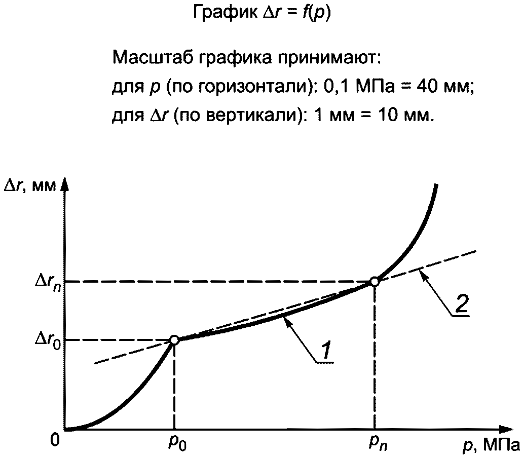 E, МПа, при испытаниях прессиометром с четырьмя цилиндрическими секторными штампами вычисляют для линейного участка графика