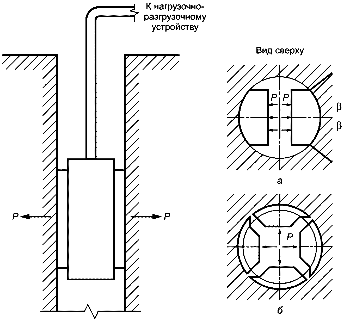 4.4 Испытания грунтов прессиометром с секторным приложением нагрузки осуществляют с помощью зонда с раздвижными стальными цилиндрическими секторными штампами, передающими горизонтальную нагрузку на стенки скважины. Схема испытаний прессиометром с секторным приложением нагрузки представлена на
