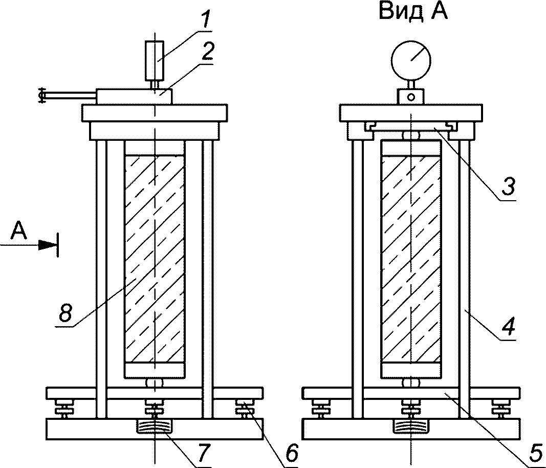 4 - нижняя опора; 5 - индикатор; 6 - образец; 7 - репер;