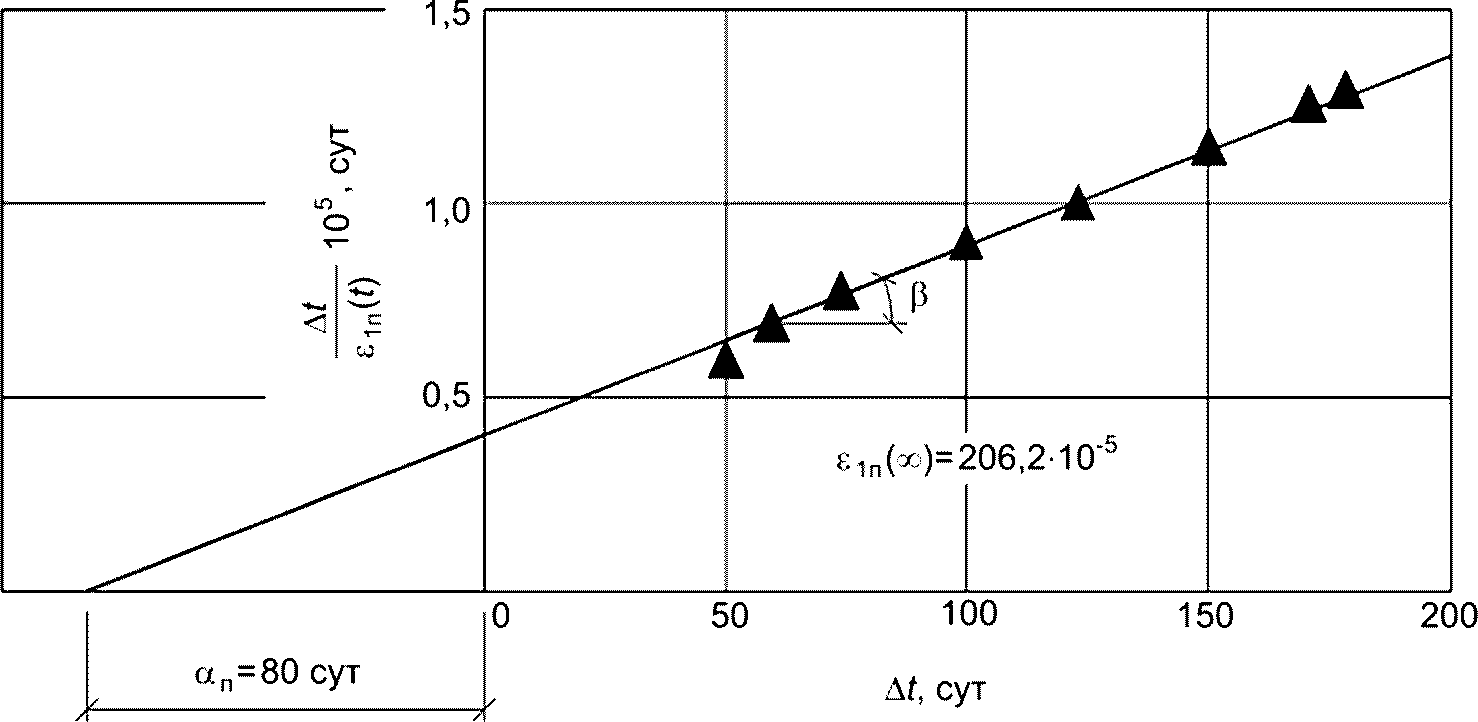 где fупt и fпt - измеренные значения прогиба в середине пролета, скорректированные с учетом просадки опор сразу после загружения от упругой составляющей и в любой момент времени от деформации ползучести соответственно.